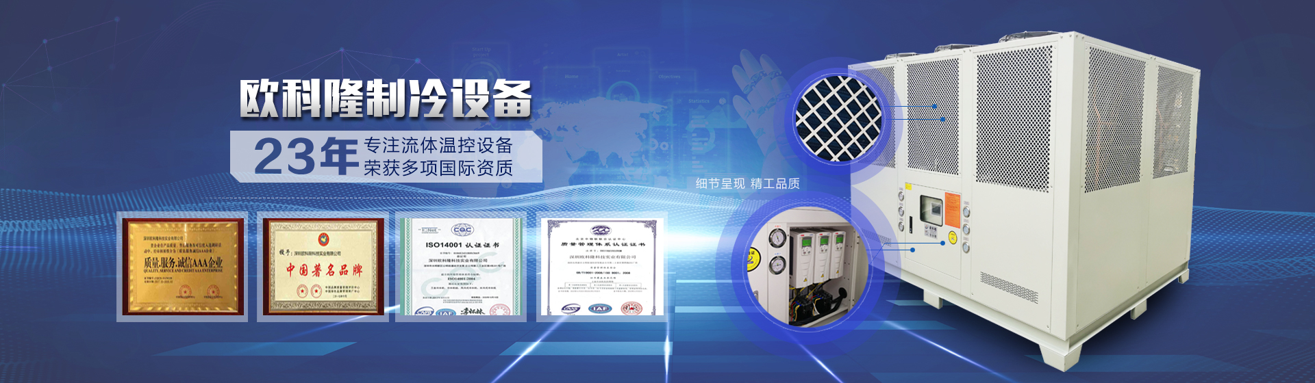 深圳歐科隆科技實業(yè)有限公司源自歐洲先進制冷技術(shù)和科學管理模式,承襲歐洲人嚴謹務(wù)實、精益求精的工作作風。1963年在洛杉磯成立,1999年在香港設(shè)立分部正式進軍亞洲市場,后經(jīng)改革開放招商引資以及日益發(fā)展需求于2006年在深圳成立:深圳歐科隆科技實業(yè)有限公司。半個多世紀以來歷經(jīng)風雨不忘初心、百舸爭流為夢前行一直專注于:工業(yè)制冷設(shè)備的研發(fā)、生產(chǎn)制造銷售、服務(wù)。經(jīng)營范圍包括:冷水機、螺桿式冷水機組、工業(yè)冷水機、水冷式冷水機、風冷式冷水機組、冷凍機、注塑專用冷水機、電鍍冷水機、混泥土專用冷水機箱式冷水機、低溫型冷水機、耐酸堿冷水機、激光冷水機、中央空調(diào)柜機、電鍍冷水機、化工冷水機、混凝土冷水機、工業(yè)冷凍機、冰水機、非標冷水機、冷卻水塔、模溫機、粉碎機、拌料機等設(shè)備及輔助設(shè)備。...更多詳情